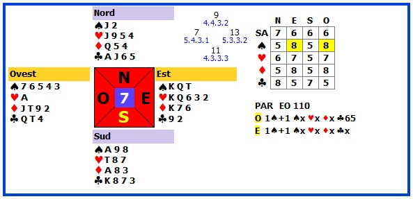 | 1 | 1♠ +2 | O | ♥5 | 140 | 105 |