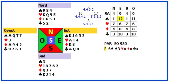 | 6 | 4♠ +1 | E | ♥2 | 450 | 105 |